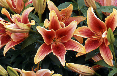 Flower Description: Back after a three year absence for time to build up our stock, 'First Crown' is a cross between Oriental and Asiatic hybrids. This suprising specimen simply glows red-orange with creamy-peach on the edges of huge, scented blooms, more like an Oriental, but colored like an Asiatic. Soft scent. 3 to 4 Feet. July Flowering. Lightly Scented.